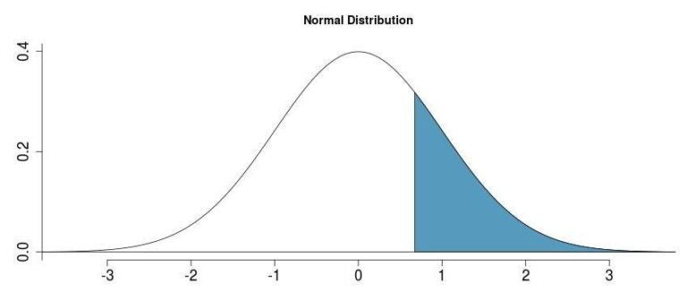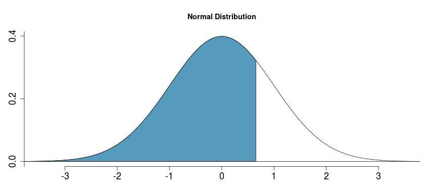 We get a value of 0.7454 so it means that 74.54% of the students scored below than Hasan i.e p(Z<0.66) = 0.7454. It also implies that 1–0.7454 = 0.2546 = 25.46% of the students scored greater than Hasan.